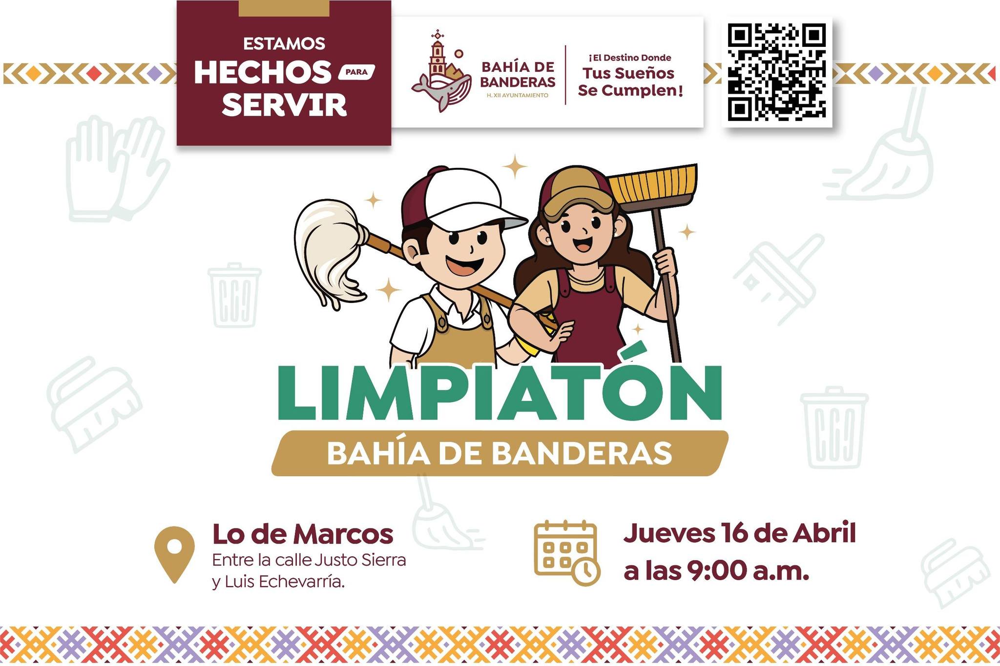 El Gobierno Municipal de Bahía de Banderas invita a las y los habitantes del poblado de Lo de Marcos a participar en la jornada del “Limpiatón”, que se llevará a cabo este próximo jueves 16 de abril a partir de las 9:00 de la mañana, teniendo como punto de encuentro la Calle Justo Sierra y Luis Echevarría.