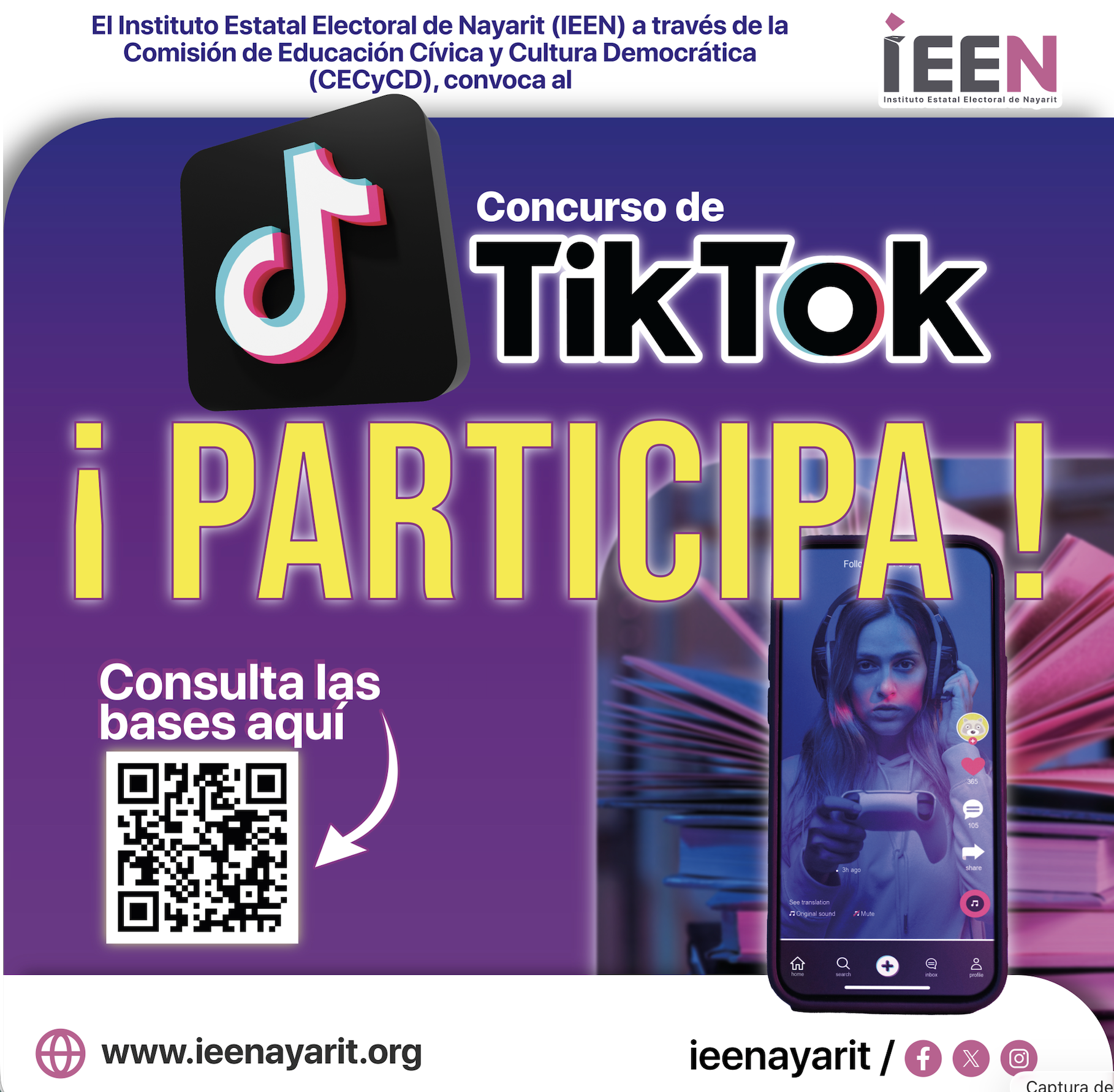 El Instituto Estatal Electoral de Nayarit (IEEN), a través de la Comisión de Educación Cívica y Cultura Democrática (CECyCD), invita a la ciudadanía a participar en la segunda edición del Concurso de TikTok, con el propósito de promover la educación cívica y la cultura democrática entre la juventud nayarita.