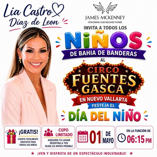 En el marco del Día del Niño, disfruta una tarde mágica en el espectacular Circo Fuentes Gasca 1 de mayo Función: 6:15 PM Un evento especial para las niñas y niños de Bahía de Banderas Aparta tu lugar y recoge tus boletos con tu embajador más cercano ZONA COSTA